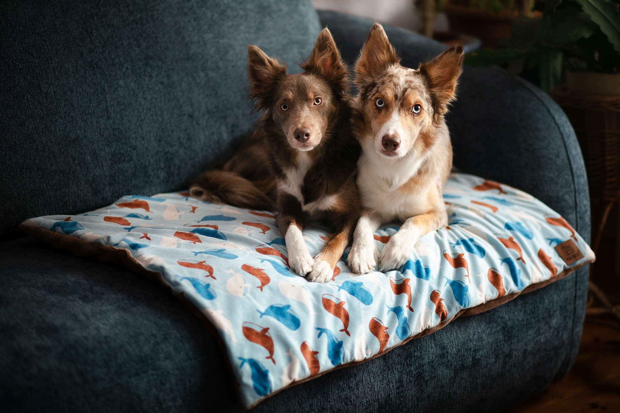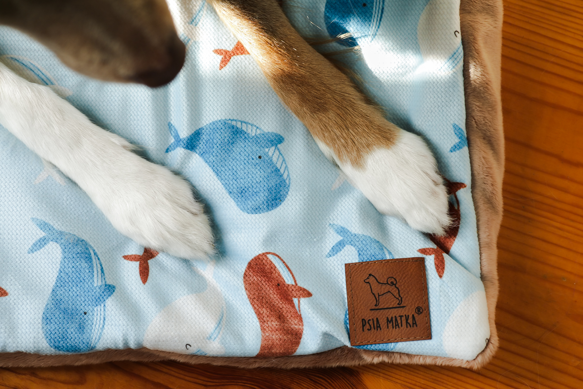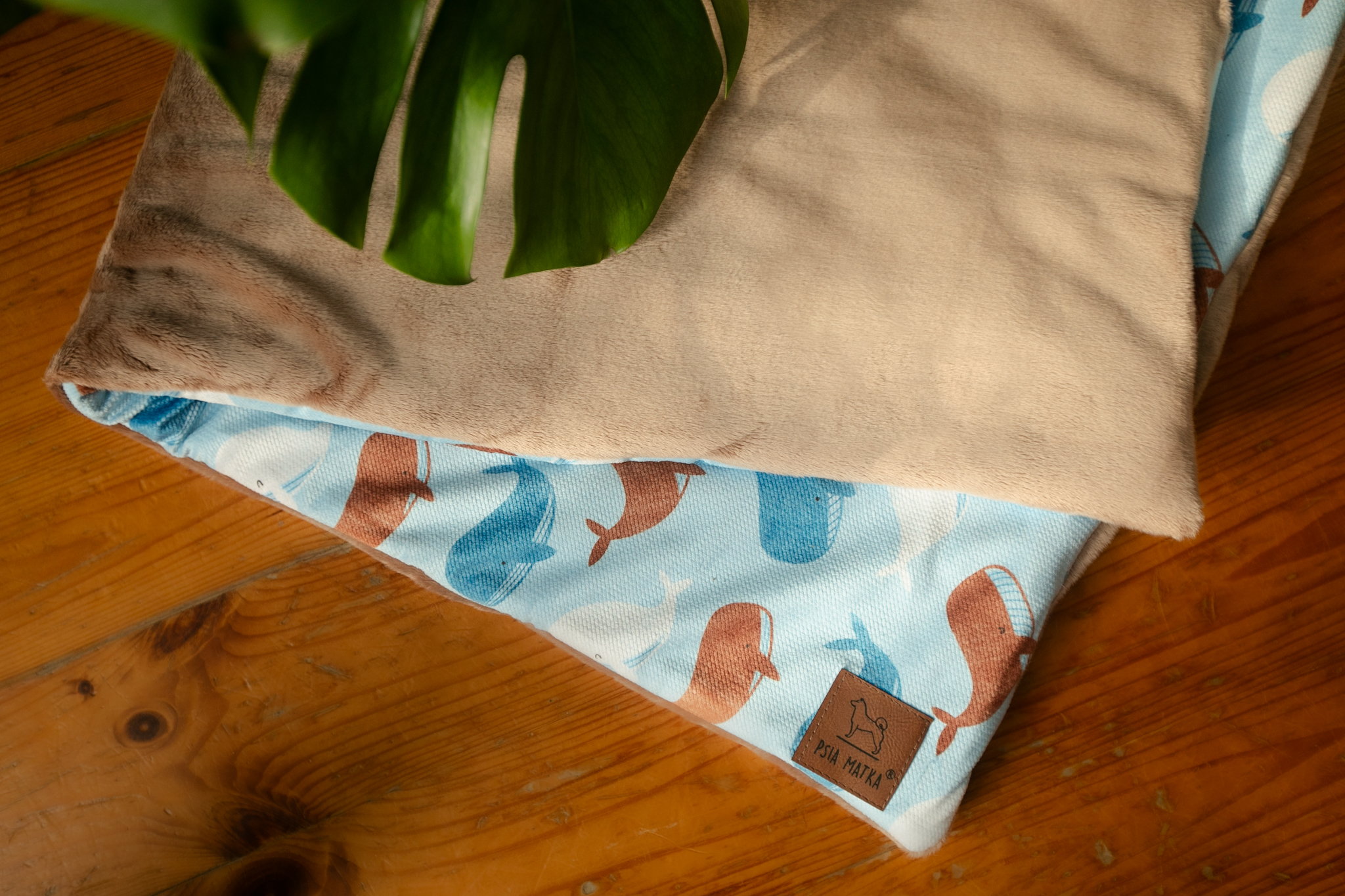 Nowa kolekcja kocyków dla psa od PSIA MATKA z uroczym printem wieloryba – „WHALE ME!”.