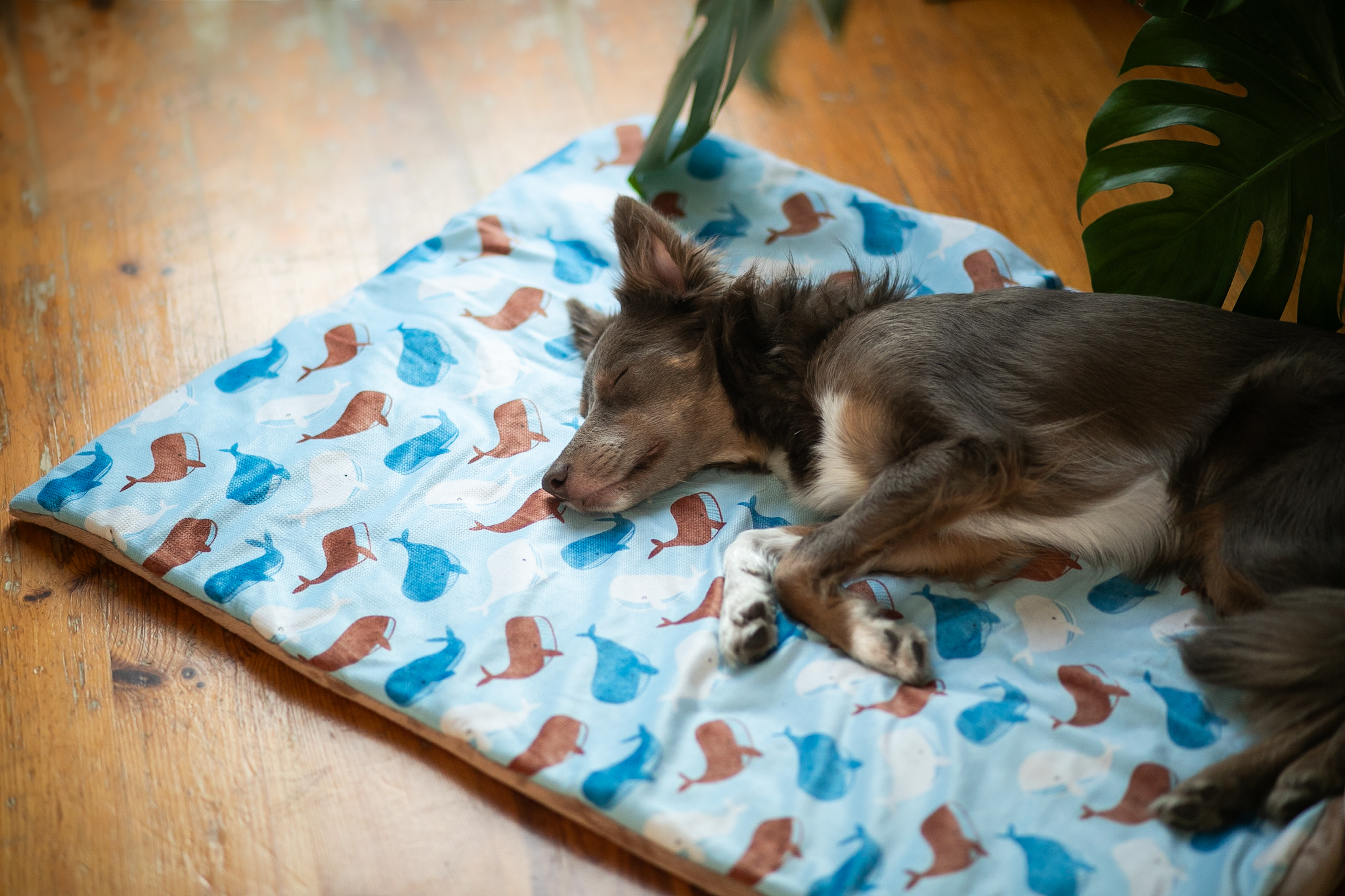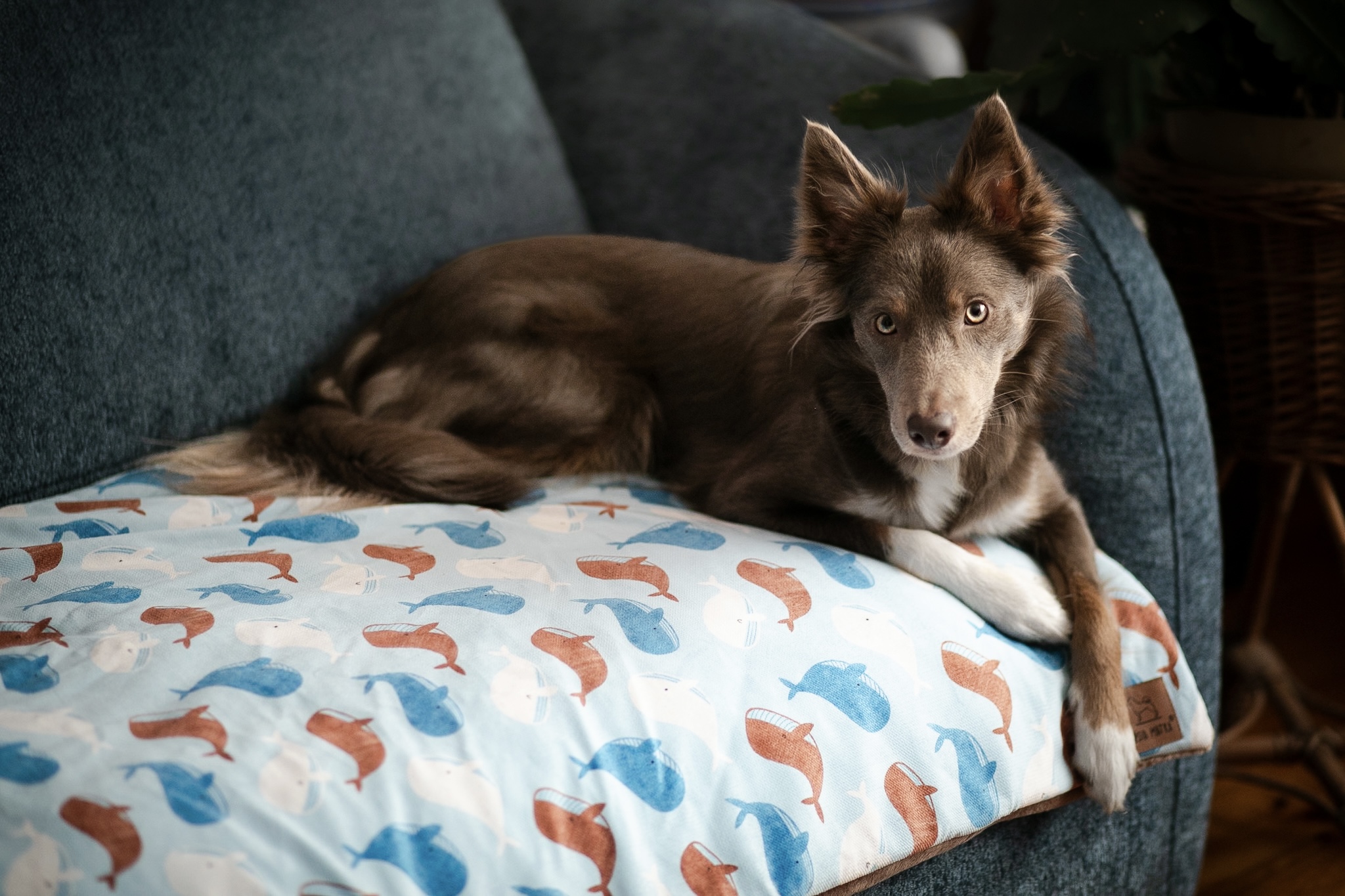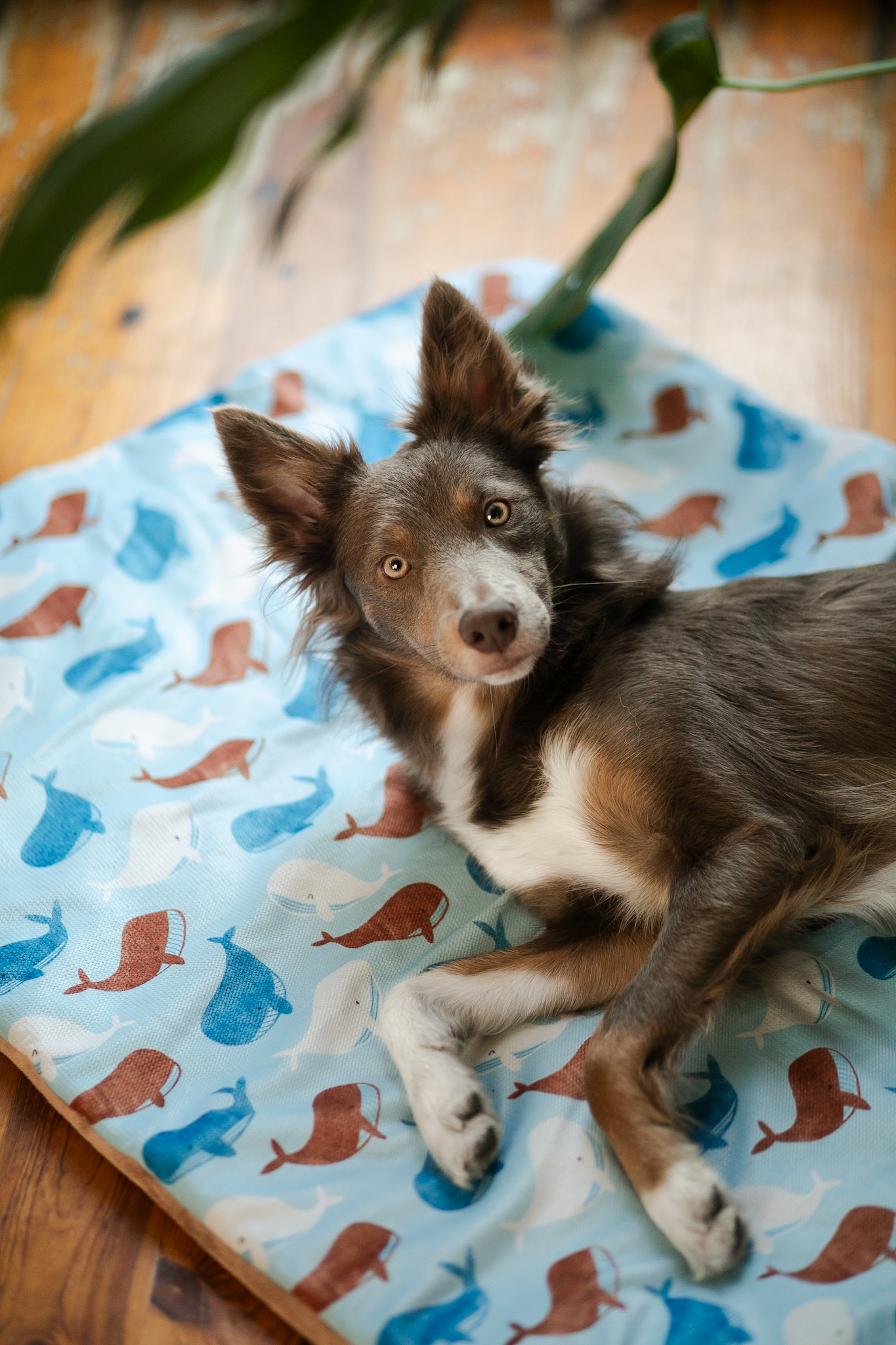Nowa kolekcja kocyków dla psa od PSIA MATKA z uroczym printem wieloryba – „WHALE ME!”.
